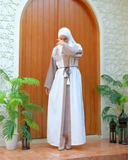 Detail bordir motif etnik pada bagian dada hingga bahu memperkaya karakter busana ini, dipadukan manik-manik tempel bernuansa mutiara lembut yang tidak berlebihan namun tetap menarik perhatian. Kombinasi ini menjadikan abaya cocok untuk momen istimewa, baik siang maupun malam.